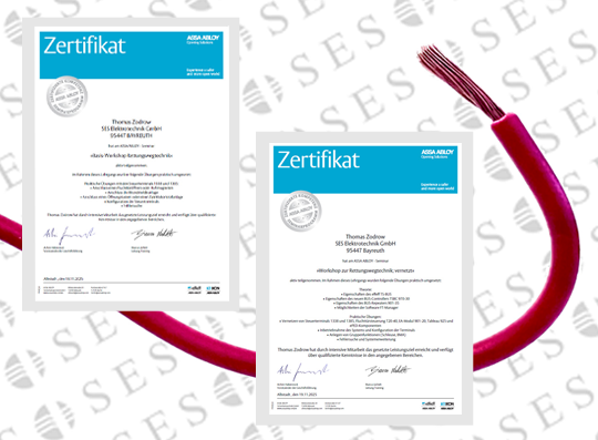 In der Zeit von 18.11. bis 19.11.2025 konnte einer unserer Mitarbeiter bei Assa Abloy am „Basis-Workshop Rettungswegtechnik“ mit weiterführenden „Workshop Rettungswegtechnik vernetzt“ teilnehmen und verfügt nun über die qualifizierenden Kenntnisse zu den aufgeführten Bereichen in den zugehörigen Zertifikaten.